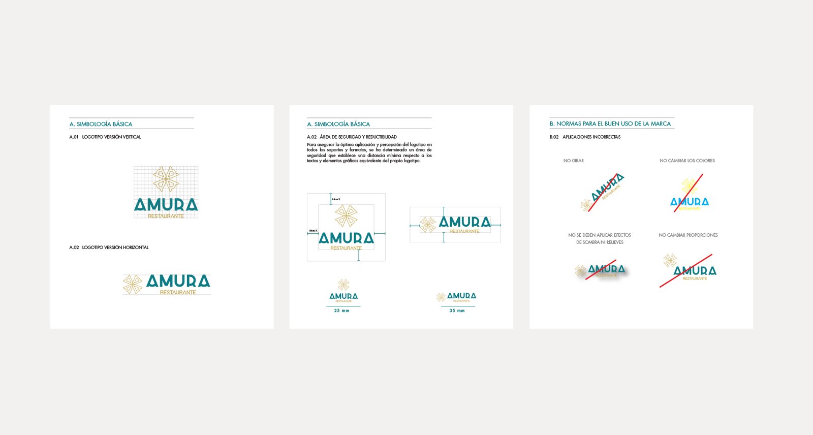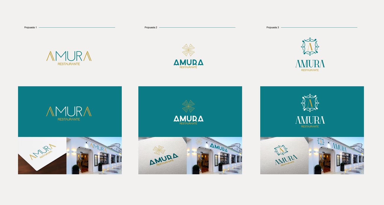 This branding project was developed for Amura, a restaurant in need of a distinctive and elegant visual identity. The process began with three different logo proposals, each exploring a different visual direction. The selected option was Proposal 1, built around a refined typographic solution in which the letter A became the central defining element of the imagotype. The final identity was later organized into a corporate manual to ensure consistency across its applications.