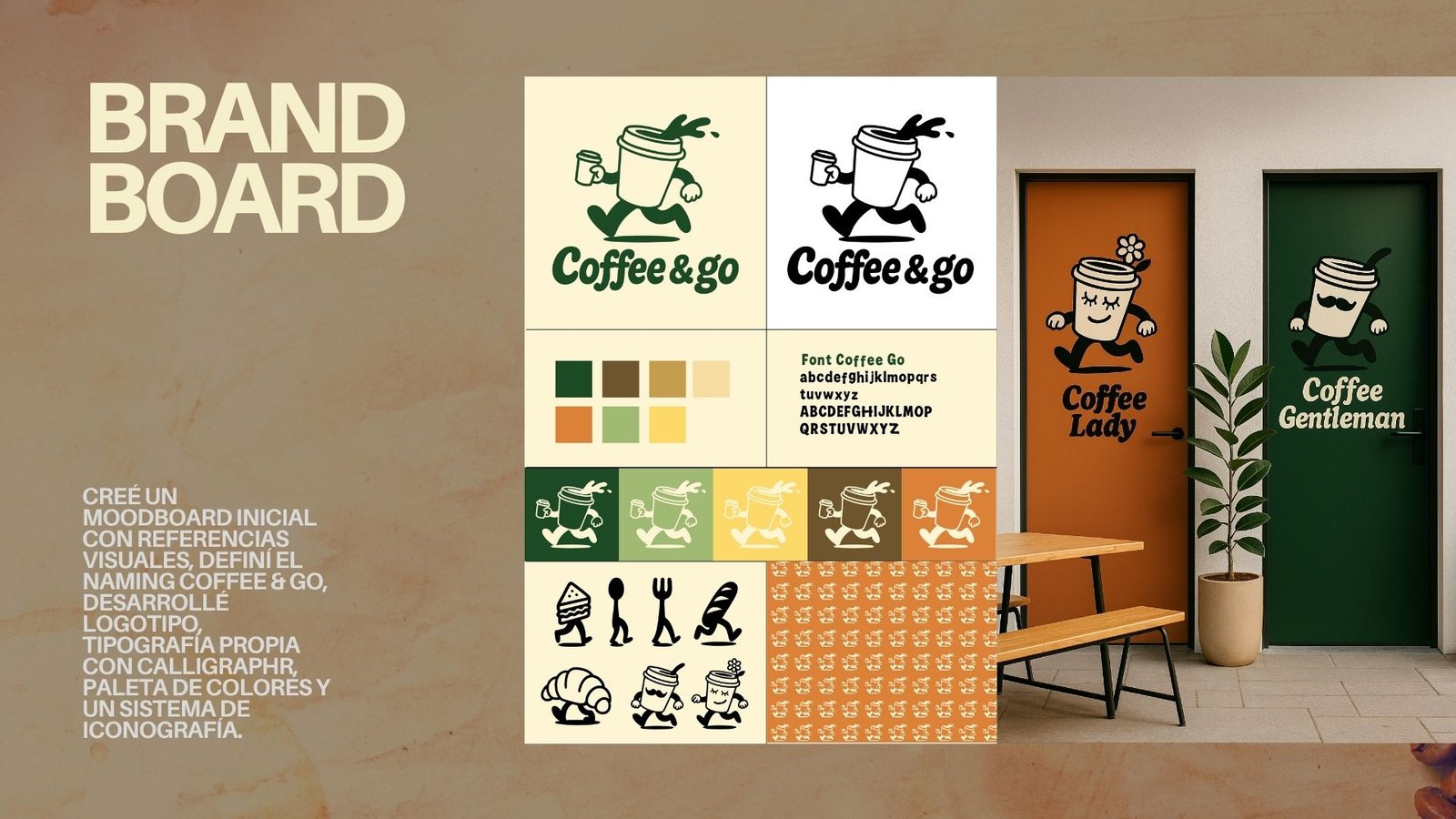 I began by defining the brand concept and naming, then developed the visual identity system for Coffee & Go. This included the logo, a custom typographic direction, color palette, graphic resources, and a playful iconographic language designed to make the brand memorable and friendly