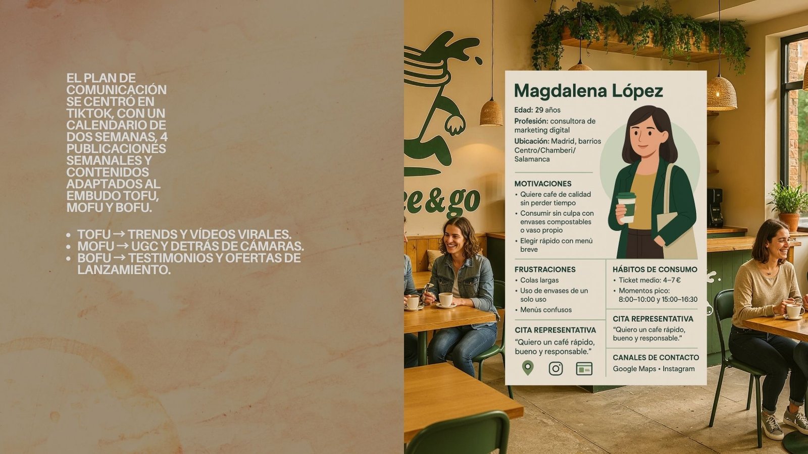 The project covered the full development of a fictional eco-friendly coffee-to-go brand, including naming, visual identity, packaging, digital communication strategy, audiovisual content, and ethical reflection.