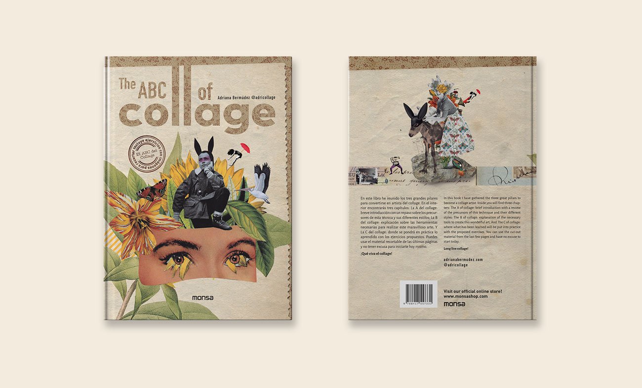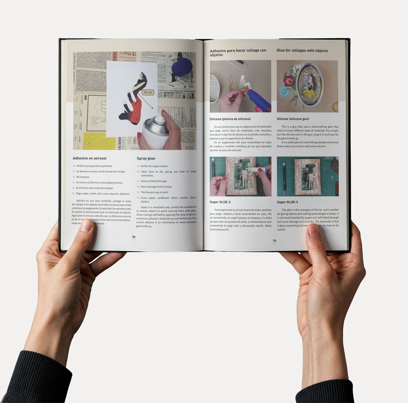 A bilingual educational book designed to teach collage through a clear visual structure and an accessible reading experience.