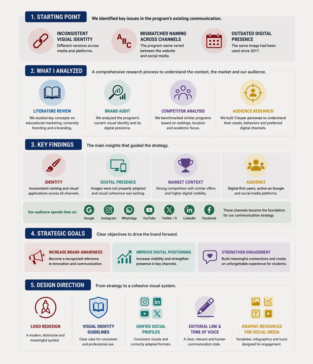 Research, diagnosis, and audience analysis defined the foundation of the visual system. Before designing, the process focused on understanding the brand’s context, identifying inconsistencies, analyzing competitors, and studying user behavior to build a clear, coherent, and effective communication strategy for the Master in Communication Strategies.