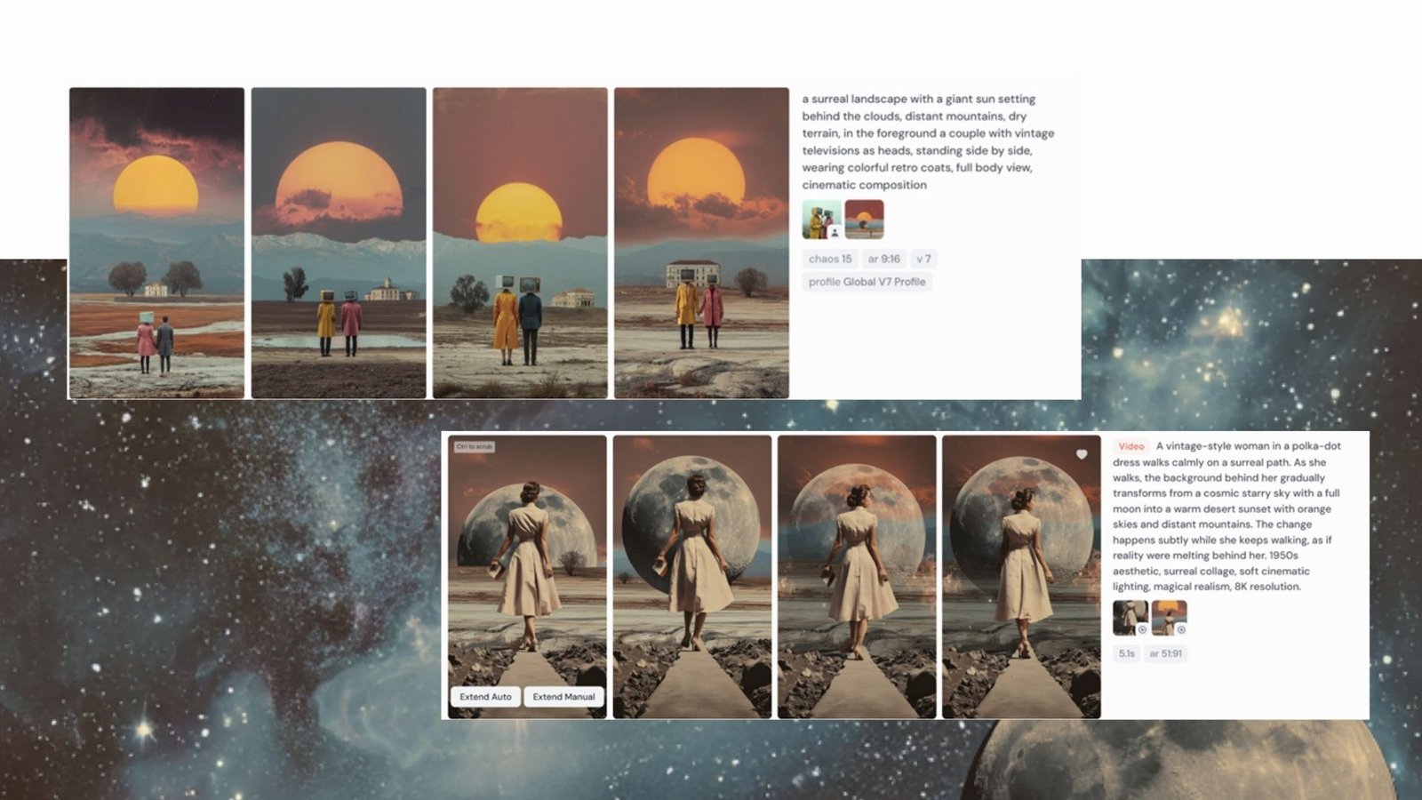 I wrote the prompts for each scene in English, carefully defining the visual tone of the piece: vintage, surreal, and rooted in an analog collage aesthetic. These prompts were used to generate the base images and to guide the animation process, including camera movement, character entrances, and transitions between scenes. In some cases, I also prepared compositions manually in Photoshop by separating characters and backgrounds, which allowed for more controlled and coherent animations aligned with my visual language.